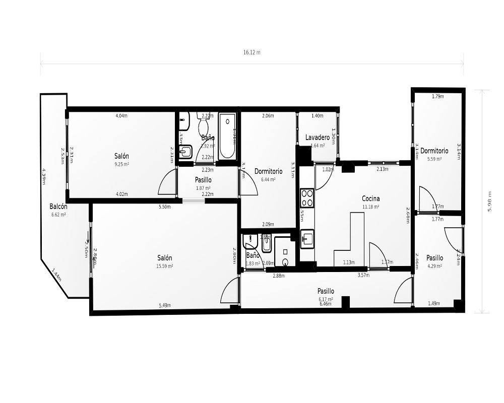| Dispone | 3 habitaciones | 2 baños |