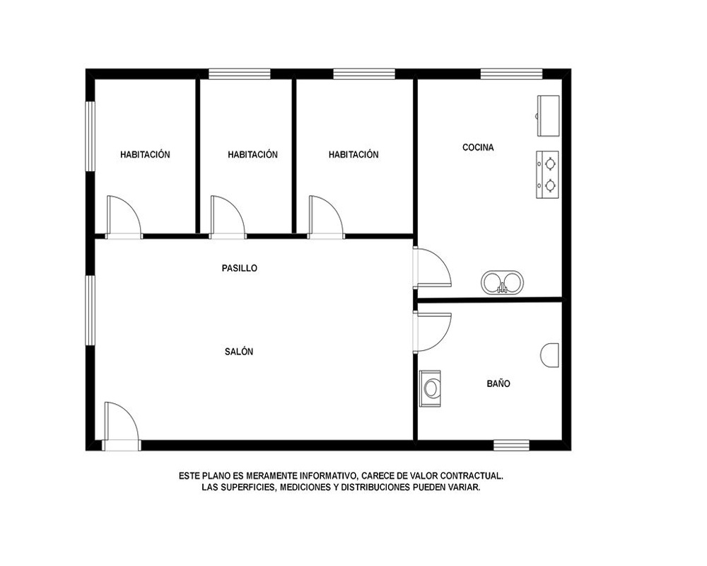 La vivienda se encuentra en la planta baja de un edificio. Tiene una superficie de 51 m² y se compone de salón-comedor, cocina, 1 dormitorio y 1 baño.