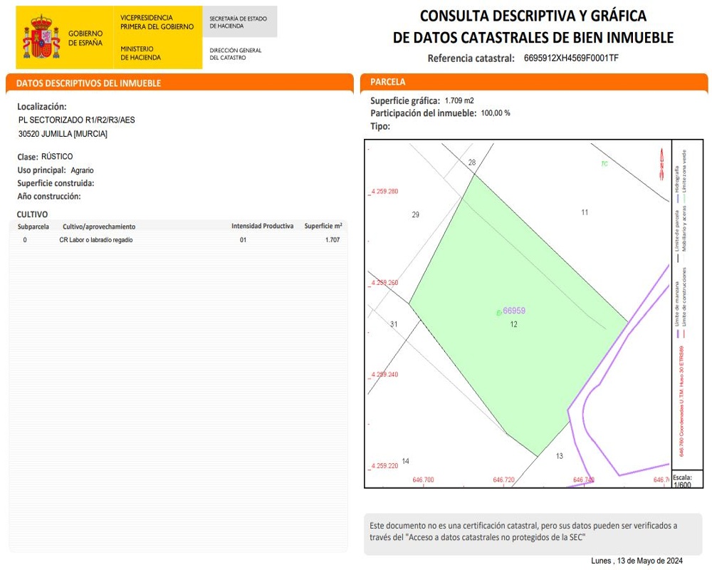 Suelo urbanizable no programado en el municipio de Jumilla provinica de Murcia. PL SECTORIZADO R1/R2/R3/AES La parcela se ubica en una zona de carácter rural al sur del núcleo urbano de Jumilla, a menos de 1 km de dicho borde y próxima al polideportivo y piscinas de la localidad. Corresponde con la Referencia Castastral 6695929XH4569F0001HF Comunicaciones, su situación geográfica es de transición y nudo de comunicaciones entre la Región de Murcia y las de La Mancha, Andalucía y Levante, por lo que cuenta con unas excelentes vías de comunicación terrestre, siendo fácilmente accesible desde prácticamente toda la Península. Para llegar a Jumilla por carretera desde Madrid, tomar la NIII y luego la N301, por Albacete. Desde Andalucía y Murcia, tomar la N-301 desde Murcia. Desde el Levante, la N430 desde Valencia y luego la N344 hasta Jumilla. Los aeropuertos más próximos se encuentran en S. Javier (Murcia) y Alicante.