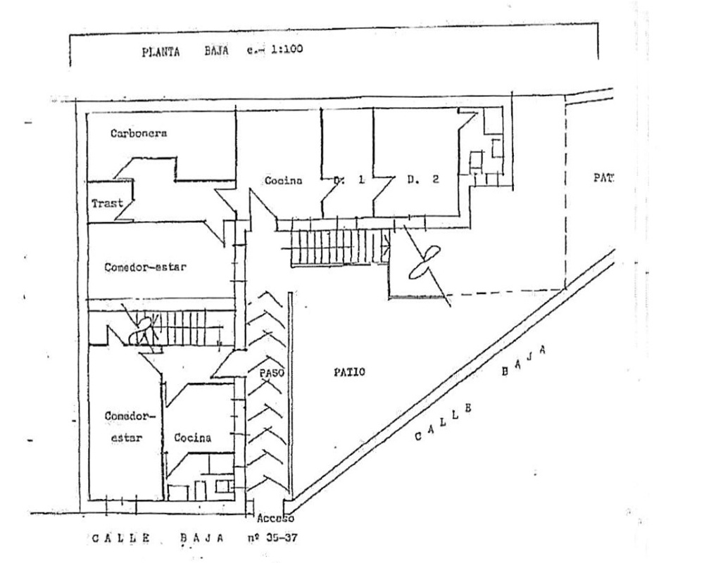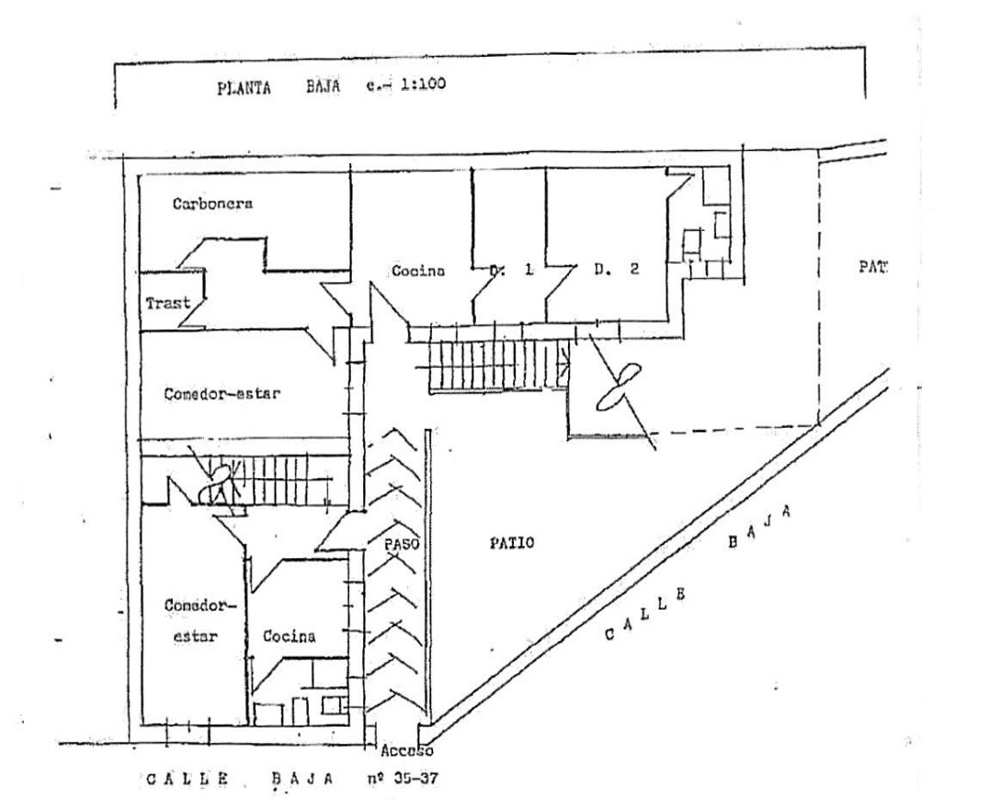 -Distribución: consta de 3 comedores, 3 cocinas, 3 baños y 9 dormitorios (es decir, un programa de tres viviendas).